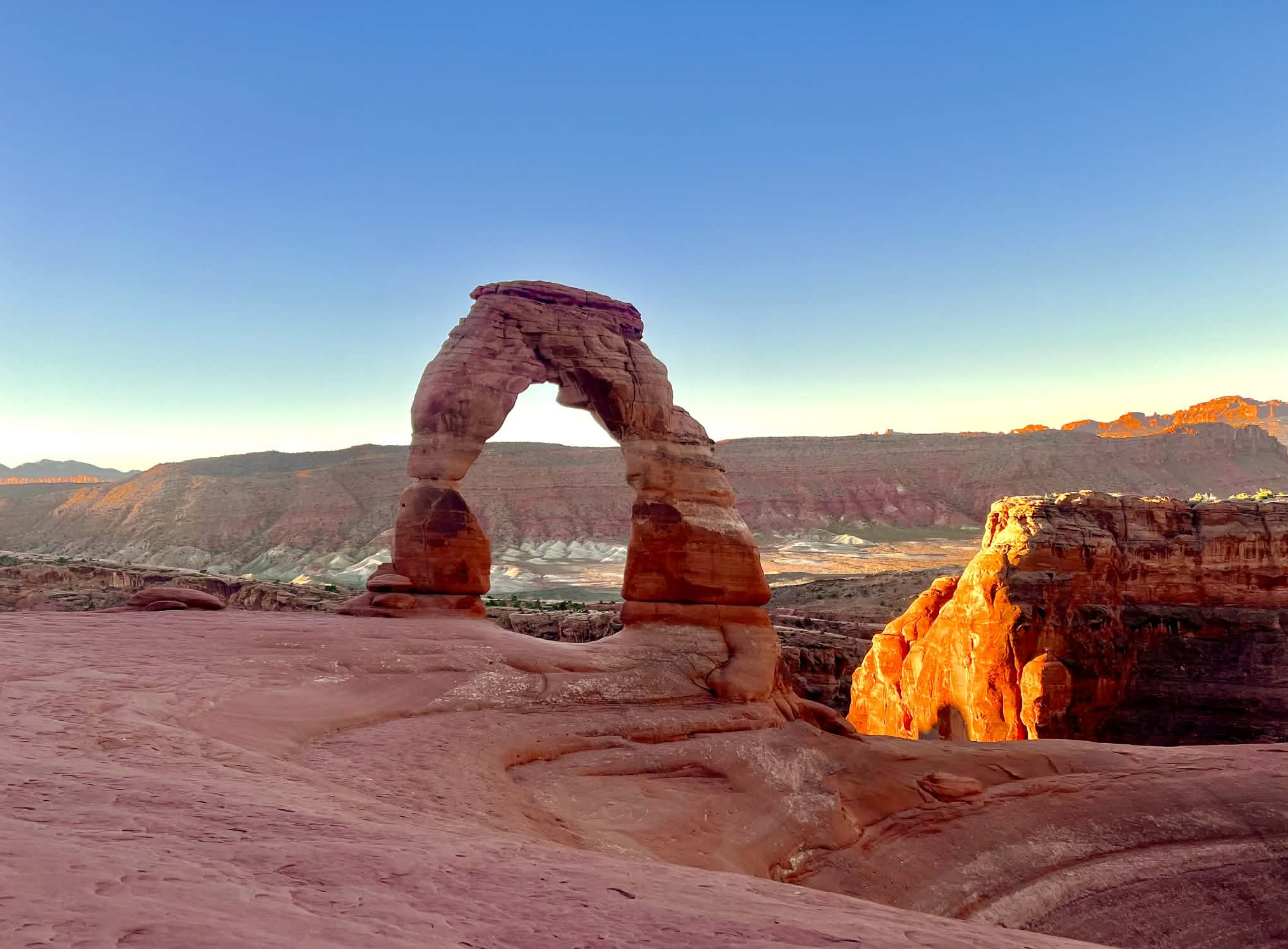 We started our day before dawn, waking up at 5:45 AM to secure a parking spot at the Delicate Arch trailhead in Arches National Park. By the time we arrived at 6:30 AM, the lot was already half full! The morning air was quite chilly, so we hiked at a brisk pace to stay warm, only realizing halfway up how strenuous the climb actually is. We reached the summit just as the sun began to rise. Sitting in the natural sandstone amphitheater, we watched the Delicate Arch stand alone against the horizon—it truly felt like the “main character” of the park.