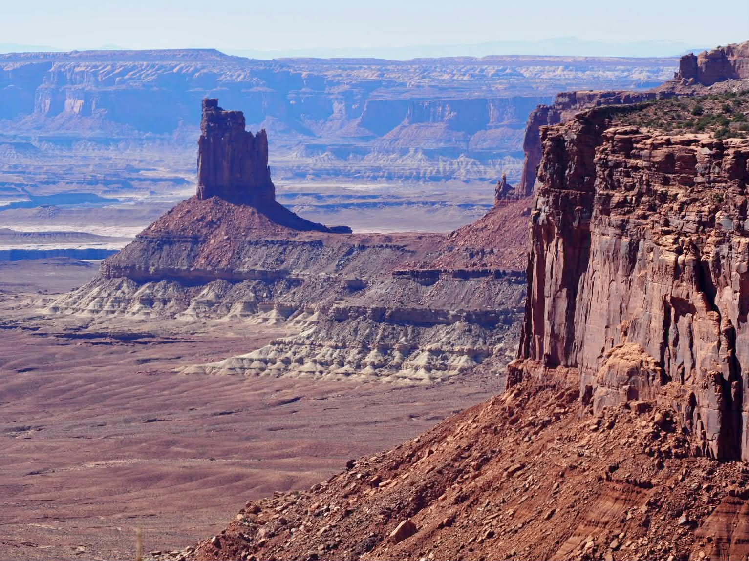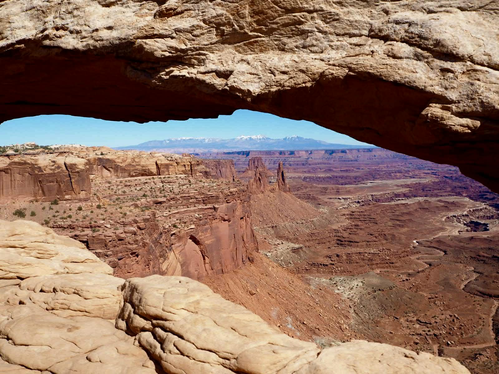 In the afternoon, we headed to the Island in the Sky district of Canyonlands National Park. We made the most of the drive by stopping at almost every vista, including the Green River Overlook, which offered a spectacular view of the river winding through the canyon floor, and Buck Canyon Overlook, where the 1,000-foot sheer cliffs were breathtaking. We also completed the short hike to Mesa Arch, which is absolutely gorgeous with the vast canyon landscape framed perfectly through the archway.