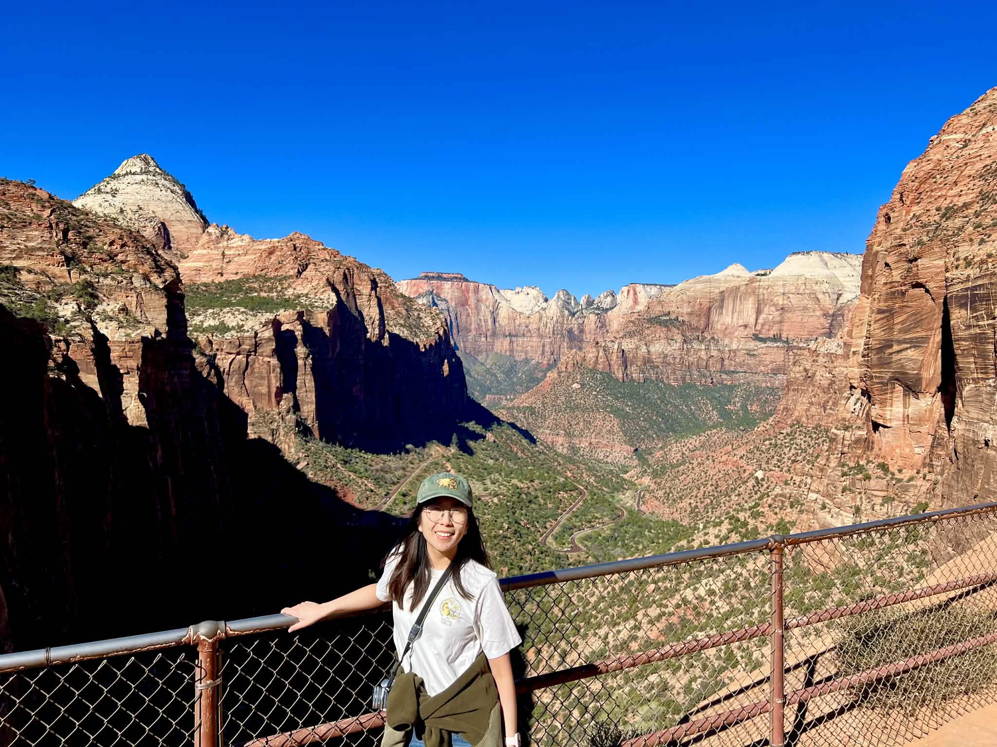 Although we didn’t fly out until the next morning, I consider today the true finale of our trip. Having stayed in Cedar City, we entered Zion National Park from the east side. Our first stop was the Canyon Overlook Trail, located just before the famous tunnel. We hiked for about an hour round-trip to reach the viewpoint. It is arguably the most accessible spot in the entire park to get a panoramic view of the canyon—certainly much easier than the strenuous climbs to Angels Landing or Scout Lookout.